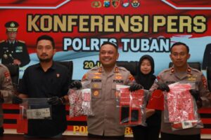 KIM Ronggolawe – Polres Tuban menggelar konferensi pers terkait pengungkapan kasus pencurian kendaraan bermotor (curanmor) yang berhasil diungkap oleh jajaran Satreskrim Polres Tuban.